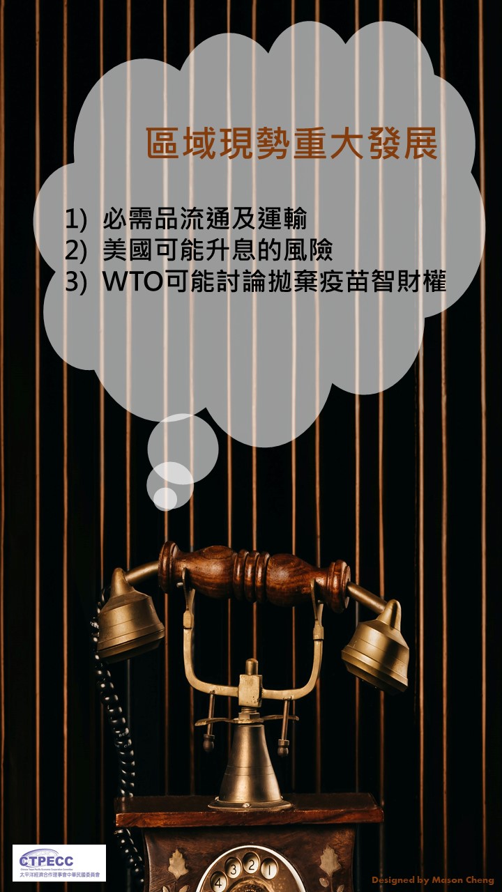 PECC秘書長Eduardo Pedrosa於區域現勢討論中,提及當前重大發展,包括必要商品 (essential goods) 的流動與相關後勤安排、WTO可能展開拋棄疫苗智財權的討論,以及美國可能升息的風險等。
