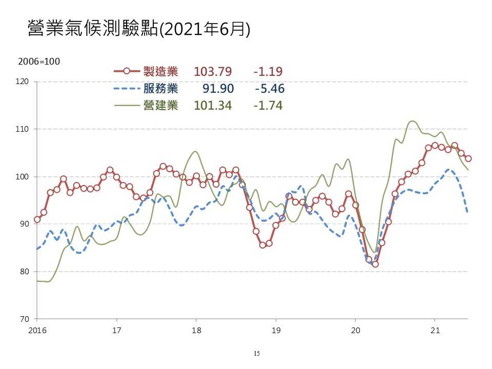 據本院調查結果,經過模型試算後,6月製造業、服務業與營建業營業氣候測驗點同步下滑。在2021年總體經濟預測方面,儘管民間消費受本土疫情爆發影響致使成長動能轉弱,然受惠於民間投資續強,外需表現優於預期,有助於帶動2021年全年經濟成長表現。