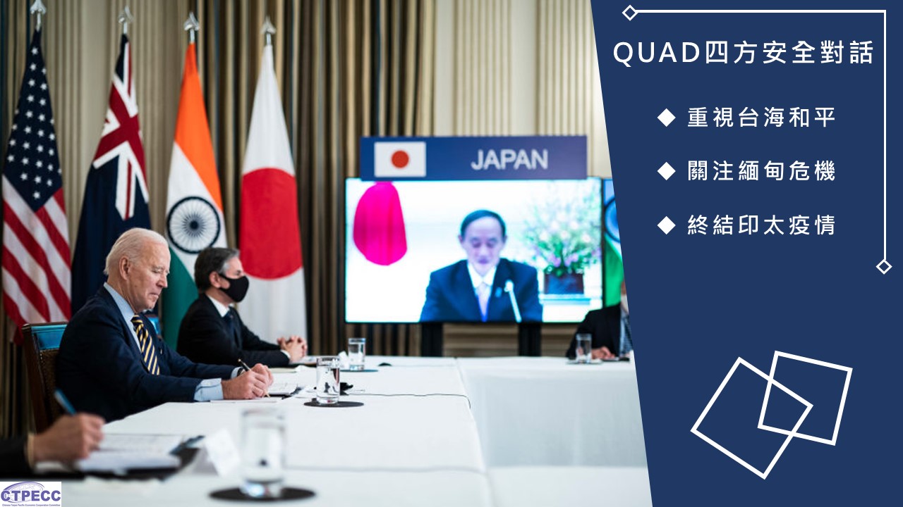 由美國、日本、印度和澳洲組成的「四方安全對話」於8月12日召開資深官員會議,以視訊方式進行。延續了今年3月12日所召開四方安全對話Quad之討論基礎,會中檢視如何在對抗假訊息、促進人權等領域強化合作。也是自美國總統拜登(Joe Biden)1月底上任以來首度提及台海和平安全的重要性。