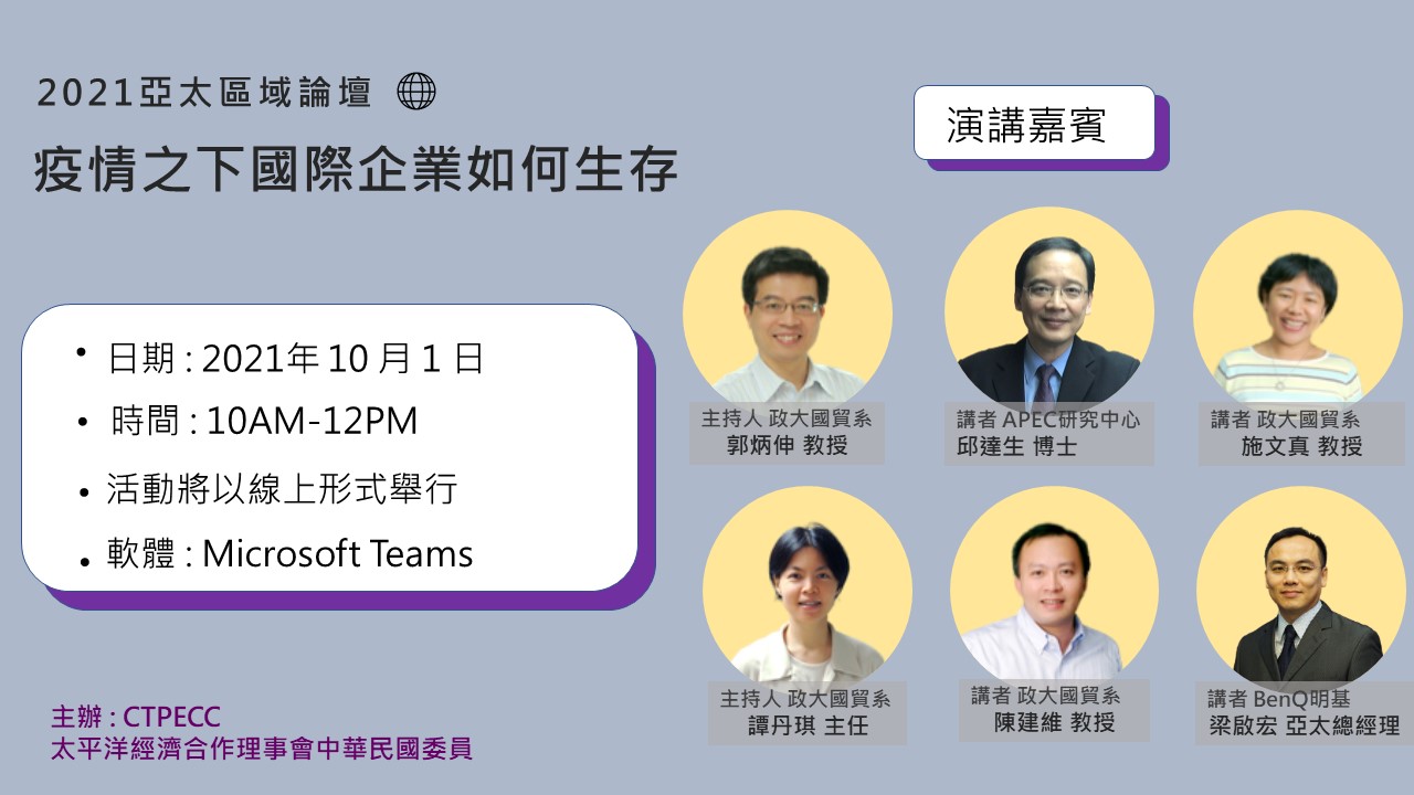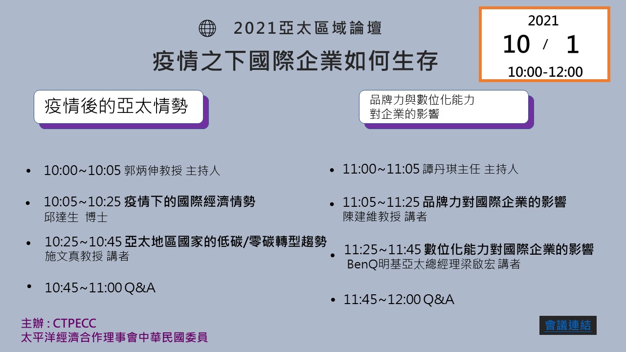 第3場論壇主題鎖定:「疫情之下國際企業如何生存」。深入探討疫情後的亞太政治經濟趨勢與國際企業在疫情時所面臨的挑戰以及應對方式。