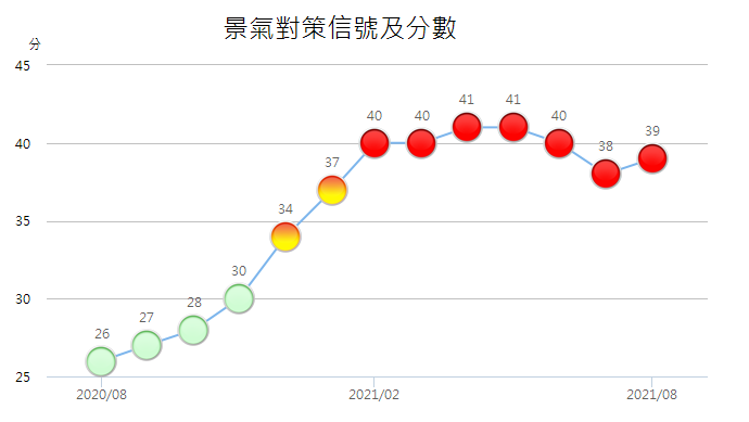 2021年年8月景氣對策信號綜合判斷分數為39分,較上月增加1分,燈號續呈紅燈;景氣領先指標轉呈上升,同時指標續呈下跌,惟跌幅較上月略降,反映疫情衝擊影響已減緩。