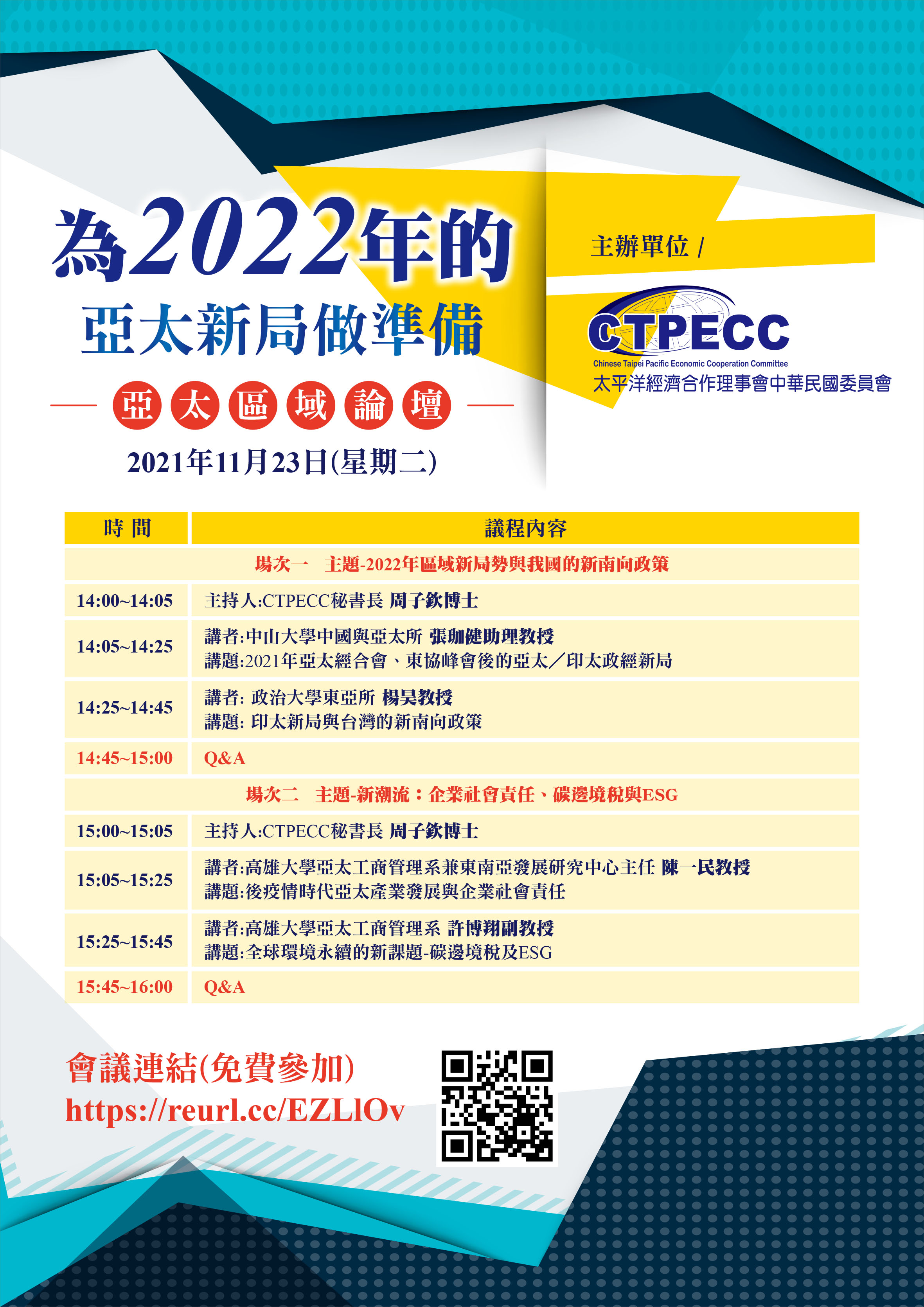 會議規劃:在2021年下半年一系列的區域與國際會議之後,亞太地區的政經趨勢與議題發展,即將迎來新局。美、中之間的戰略競爭態勢日趨明顯,牽動本區域在安全、貿易投資、產業鏈、科技佈局等方面的變化,為各界所關注。這些變化對我國的新南向政策來說,也意味著新的契機。另外,美、中戰略競爭也為雙方在環境議題上共同合作的前景,新增不確定性。然而迫在眉睫的氣候變遷壓力,以及隨之而來要求企業界共同強化在環境與企業社會責任方面的呼聲,勢將籠罩2022年的區域商業環境。