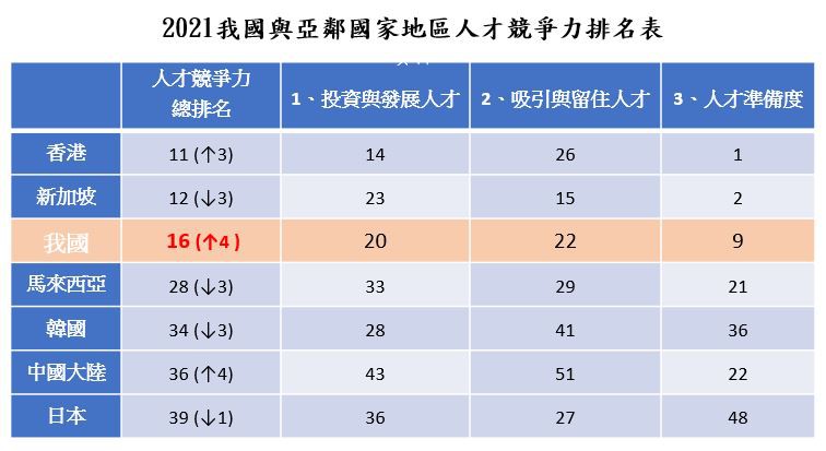 瑞士洛桑管理學院(IMD)於2021年12月9日發布「2021年IMD世界人才排名報告」,在64個受評比經濟體,台灣排名第16名,在亞洲地區,我國排名保持第3名,僅次於香港的第11名、新加坡第12名,優於第34名的韓國、第36名中國大陸以及第39名的日本。排名較去年進步4名,為近10年以來最佳表現。