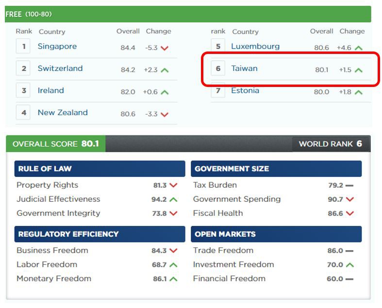 美國智庫傳統基金會自1995年起公布經濟自由指數,以各國在法治、政府規模、規範效益、開放市場等4大領域政策與情形作為評鑑依據,底下再分出12細項。另外,在評鑑結果方面則區分為「自由」(Free)、「大致自由」(Mostly free)、「適度自由」(Moderately free)、「大致不自由」(Mostly unfree)、「壓迫」(Repressed)等共五個主要評比結果。其中,我國在12項評比細項中,分別在商業自由、貿易自由、貨幣自由、財產權、政府開支等8項都獲得80分以上的得分。