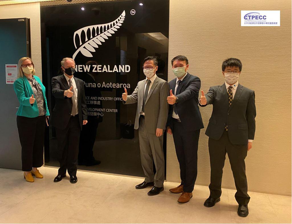 紐西蘭商工辦事處官員與CTPECC秘書處成員相見歡:駐台代表馬嘉博(Mark Pearson)(左中)、經濟組組長陸雅蘭(Alexandra Reuhman) (左一)、CTPECC成員周子欽秘書長(右中)。