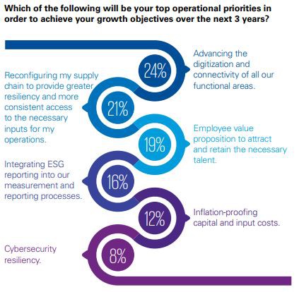 調查報告指出,供應鏈風險被視為最大的威脅,企業應以「提高韌性」為優先。其中,有68%的CEO表示,企業目前需優先完成的事項就是確保其供應鏈如何在快速變化的市場及客戶競爭壓力下仍具有韌性。儘管疫情打亂供應鏈,77%的CEO表示,自疫情發生以來,他們對於企業有更緊密的情感連結、使命感增加;67%CEO表示,其企業總體目標是為利害關係人創造長期價值;高達92%CEO認為向利害關係人傳達企業ESG目標,將對客戶關係產生極大的正面影響。若無法滿足利害關係人對於ESG的期望,將會影響人才招募,並降低企業競爭優勢。
