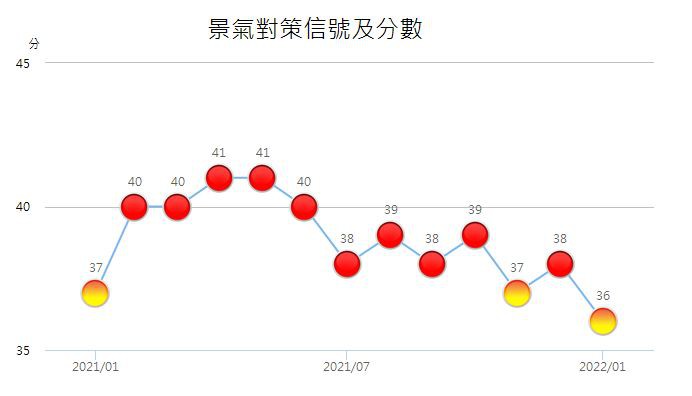 2022年1月景氣對策信號綜合判斷分數為36分,較上月修正值38分減少2分,燈號由紅燈轉呈黃紅燈;領先指標微幅下跌,但同時指標持續上升,顯示國內景氣仍處穩健成長。