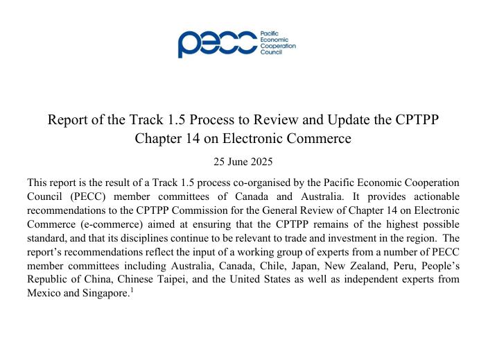 由加拿大CANCPEC與澳洲AusPECC主辦的「檢討與更新《CPTPP》第14章『電子商務』」1.5軌進程最終報告與建議正式發布。該計畫自2024年11月啟動,歷經三場混合與線上圓桌會議,共有來自11個經濟體、超過20位數位貿易專家參與,提出13項具體建議,旨在推動《CPTPP》第14章邁向「前沿水準」(frontier-level),以回應快速演變的數位經濟環境。